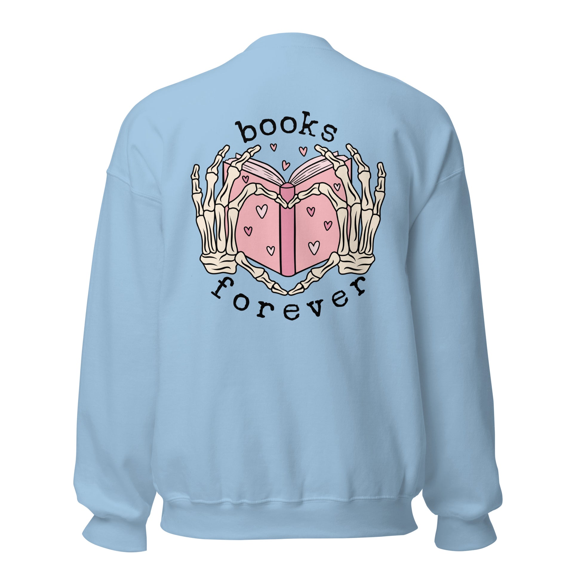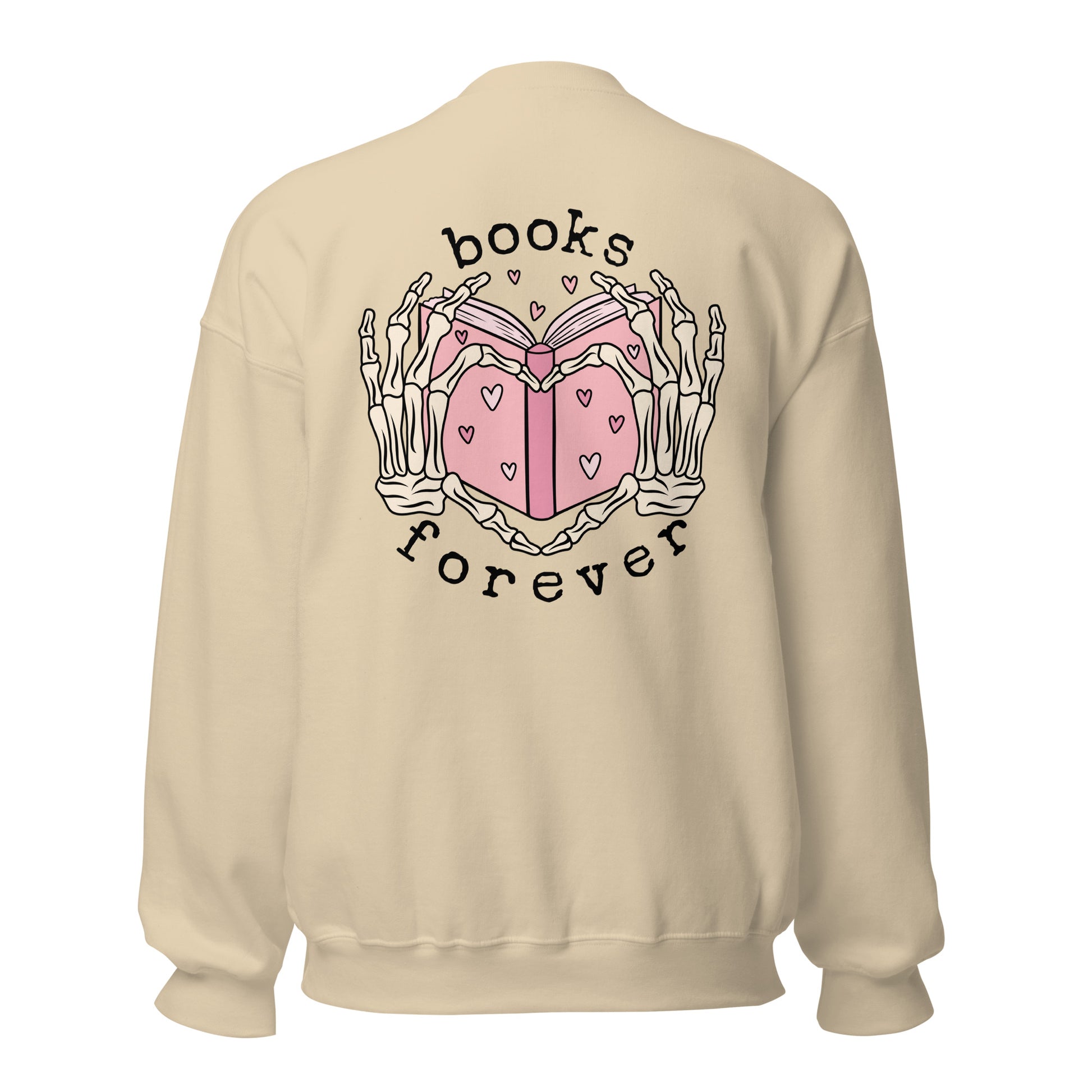 BookTok sweatshirt med brodert tekst foran og stort print på ryggen.