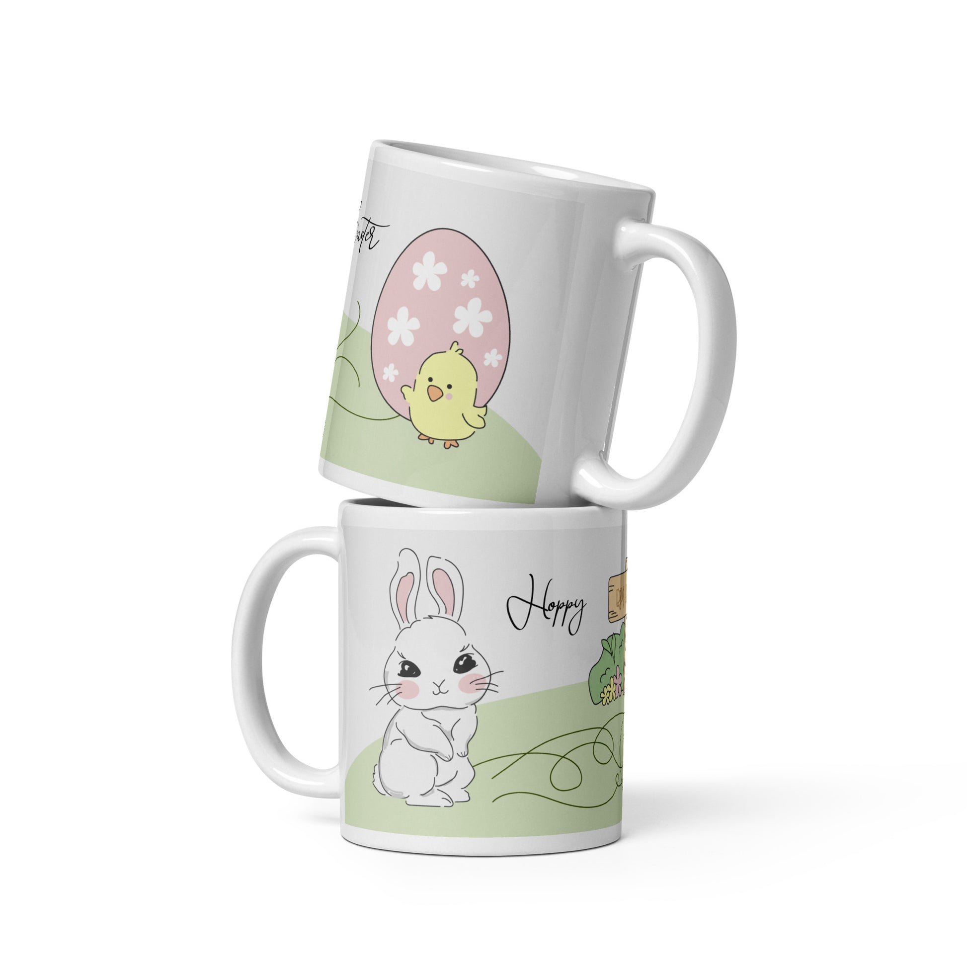 Bunny påske krus som er perfekt for påskeferien. Fyll kruset med kaffe, varm sjokolade eller annen varm drikke du elsker. Kruset er hvit med en farget kant, innsiden og håndtaket.
