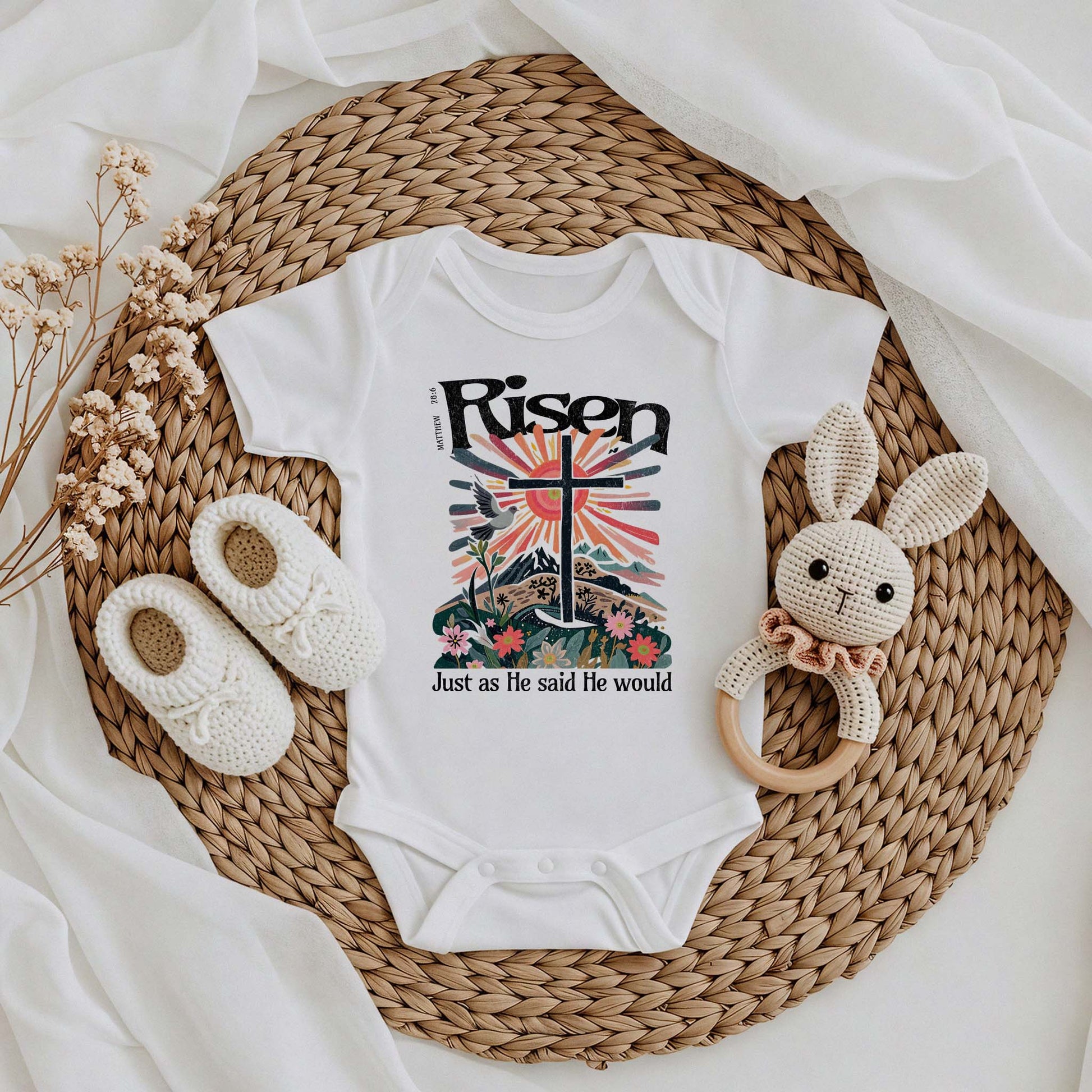 Hvor nydelig er ikke denne babybodyen? 💛 Med teksten "Risen Just as He Said He Would" minner den oss om håpet og gleden i påsken – en perfekt måte å feire troen på, helt fra de aller minste!