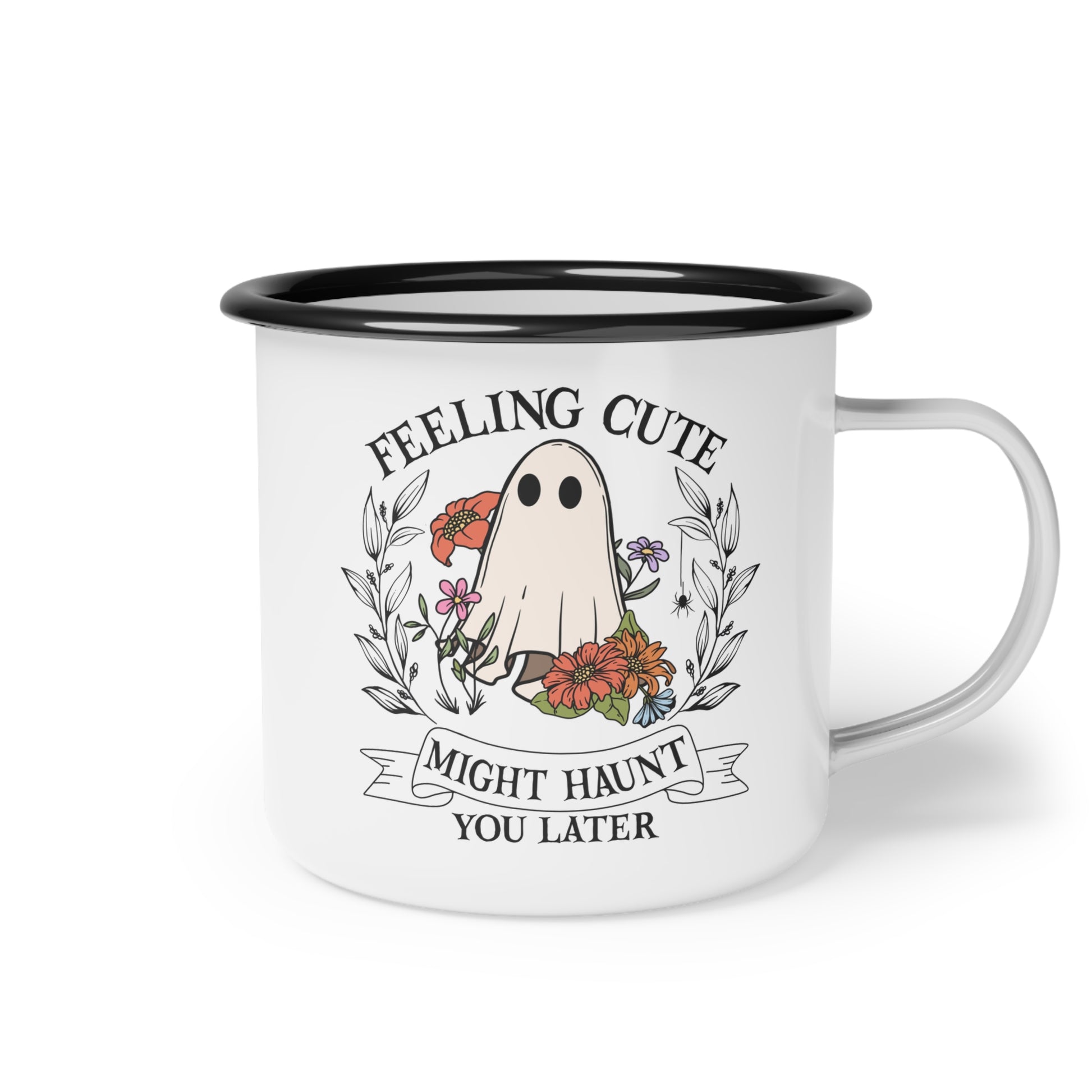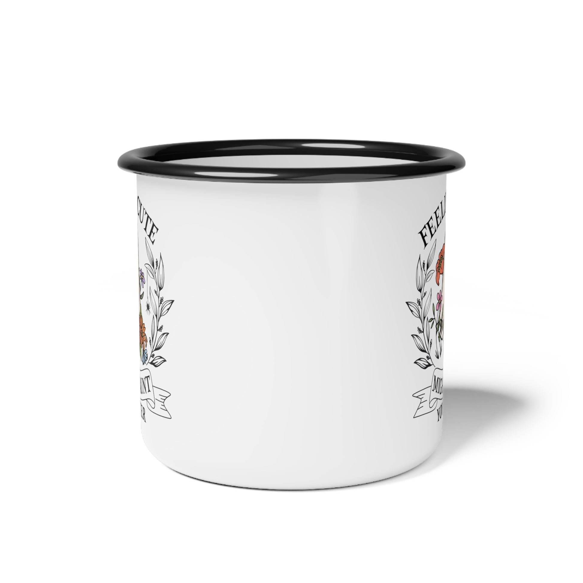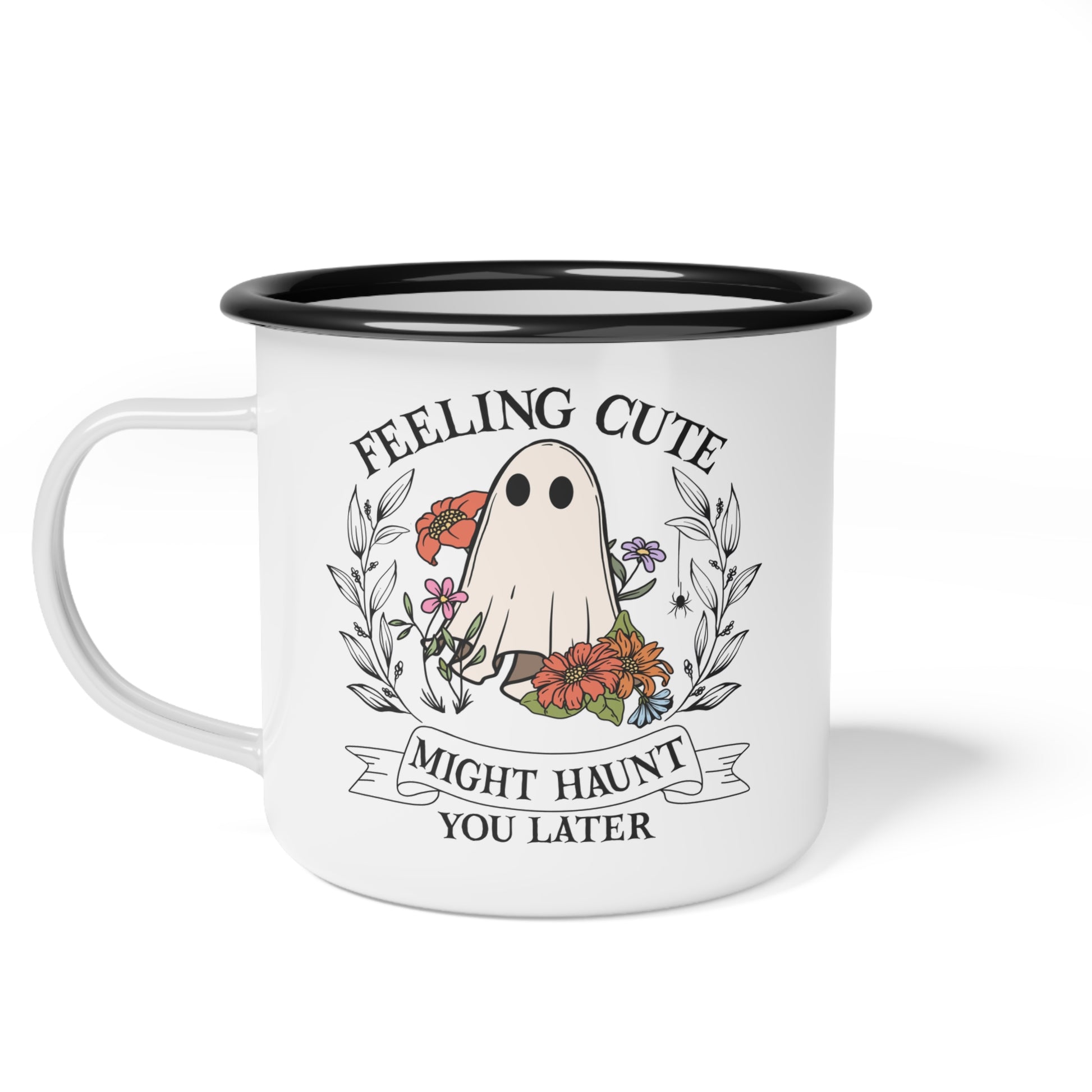 Hvitt emaljekrus med svart kant og spooky print. Lett og robust turkrus til bĂ„lkaffe, kakao og te pĂ„ hyttetur, camping og fjelltur. Perfekt emaljekopp som turkopp eller kaffekopp i emalje, enkel Ă„ ta med i sekken og super til Halloween-stemning Ă„ret rundt. đđ€