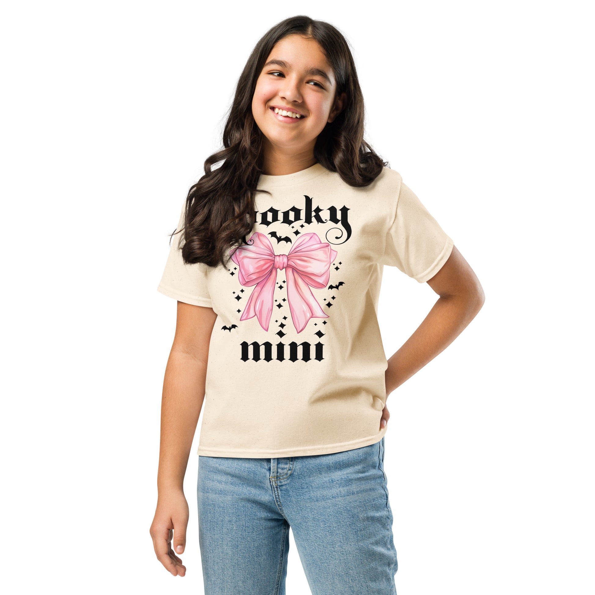 Spooky Mini Halloween T-skjorte. Halloween t-skjorte i 100% bomull. Med et søtt og morsomt Halloween-design, matcher denne t-skjorten perfekt slik at både voksne og barn kan feire Halloween måneden sammen i stil. Enten du skal på en fest eller bare vil spre litt skummel glede, er denne t-skjorten et must-have for hele familien.